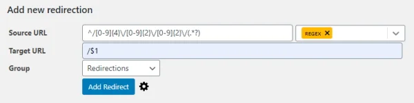 So, on the target URL just specify the group /$1. All the old links with the old URL structure with the date will now be redirected to the new URL structure.